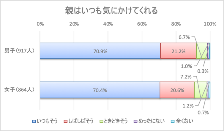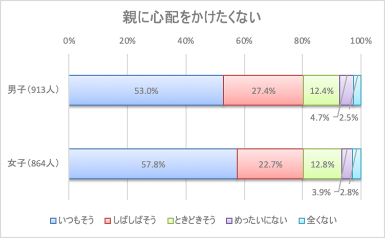 今回の調査からは、多くの生徒が親と仲が良いと回答し、また親からの気遣いや親への配慮を意識していることがわかりました。また、親との仲の良さに関しては性差が見られ、父親とは男子が、母親とは女子が、より「仲が良い」と回答していることがわかりました。