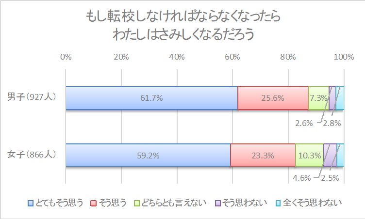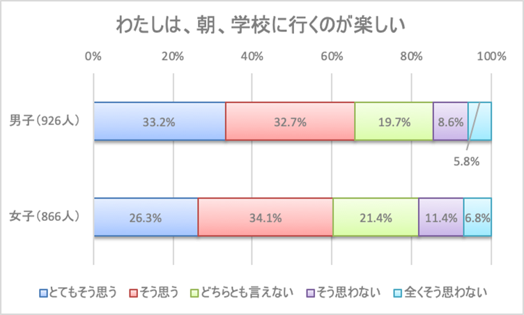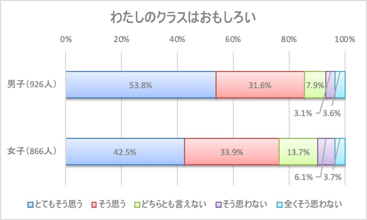 次に学校・クラスへの印象を見てみます。こちらも全体的に自分が属するクラスへ愛着を感じている、学校生活を楽しいと回答する生徒が多いという結果が得られました。また3つの質問全てにおいて、女子より男子の方が学校・クラスへ好印象を持っていることがわかりました。