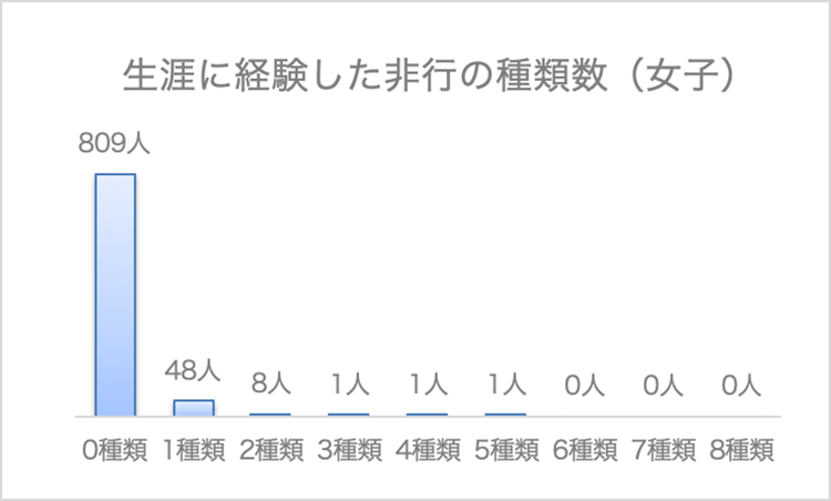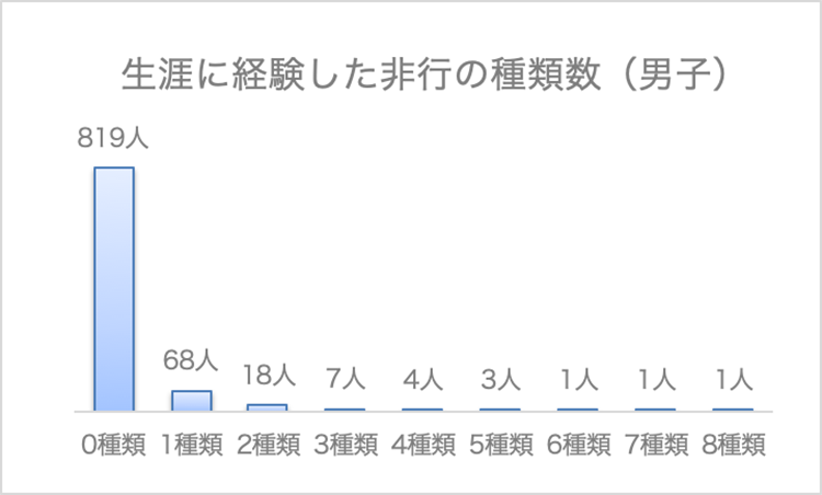 下記グラフは、生涯に経験した非行の種類数を男女別に示したものです。男女ともに大多数が「0種類」となっています。1種類以上ありと回答したのは男子103人(11.2%)・女子59人(6.8%)と、男女とも少ないことがわかります。