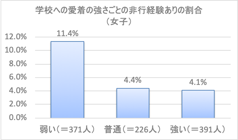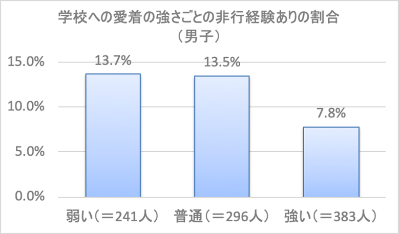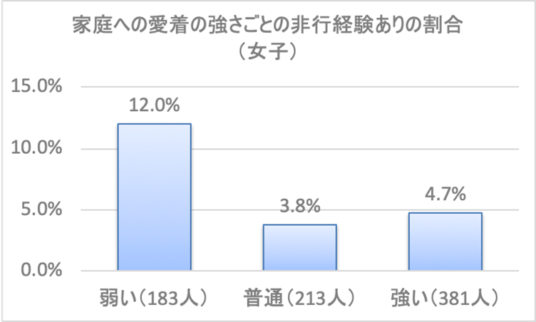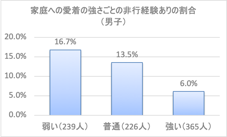 それでは、今回の調査で得られた家庭・学校への愛着(*3)の強さと、非行経験(*4)の関連性を見てみましょう。