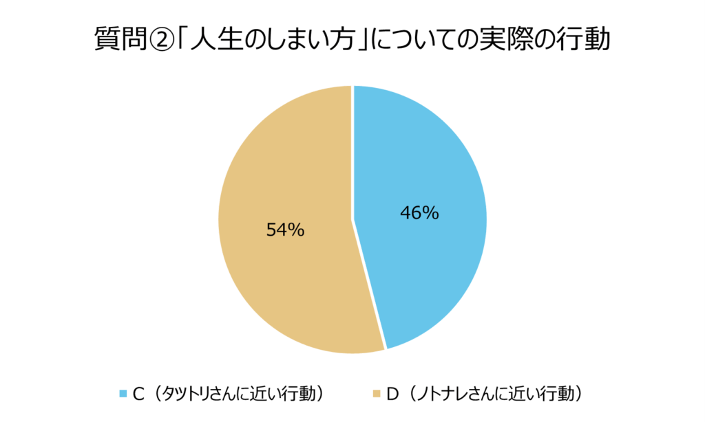 | Question 1: What are your thoughts on "how to end your life"? Which sentence, A or B, do you think is better?Your thoughts and intentionsIs it close to? A. I like to have things in order and decided before the time comes. B. I don't want to think about it or prepare for it until that time comes. Question 2: Your actual actions regarding "how to end your life": Which of the statements, C or D,Your actual actionsIs it close to? C. I have tried to organize things before. D. I have never tried to organize things before. |